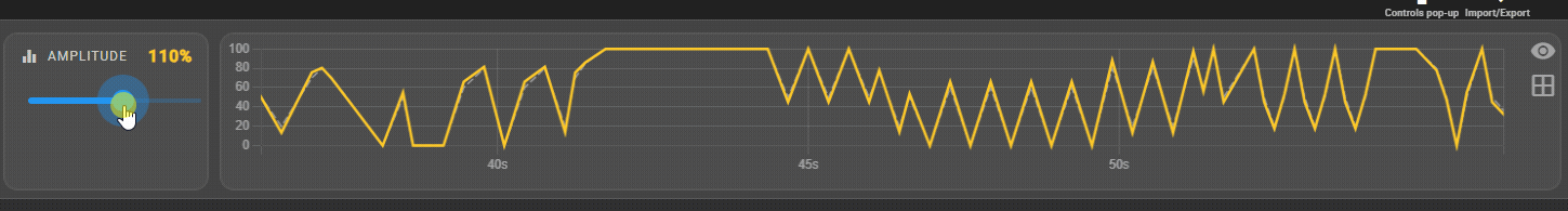 0% → the device stays still (flat line).100% → original script amplitude.>100% → amplified strokes, keeping timestamps intact.Changes are applied instantly while you drag the slider and are mirrored on the controller UI.