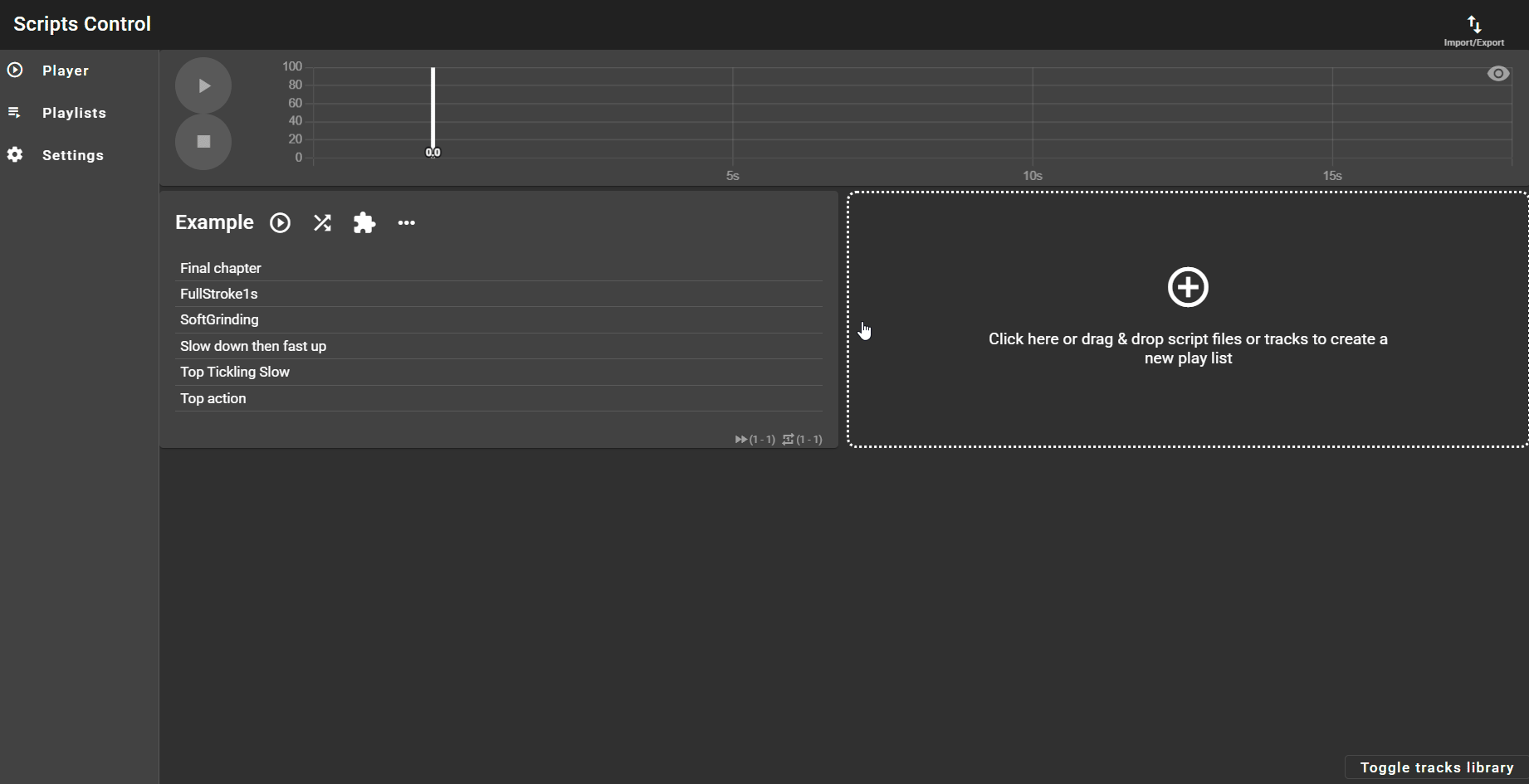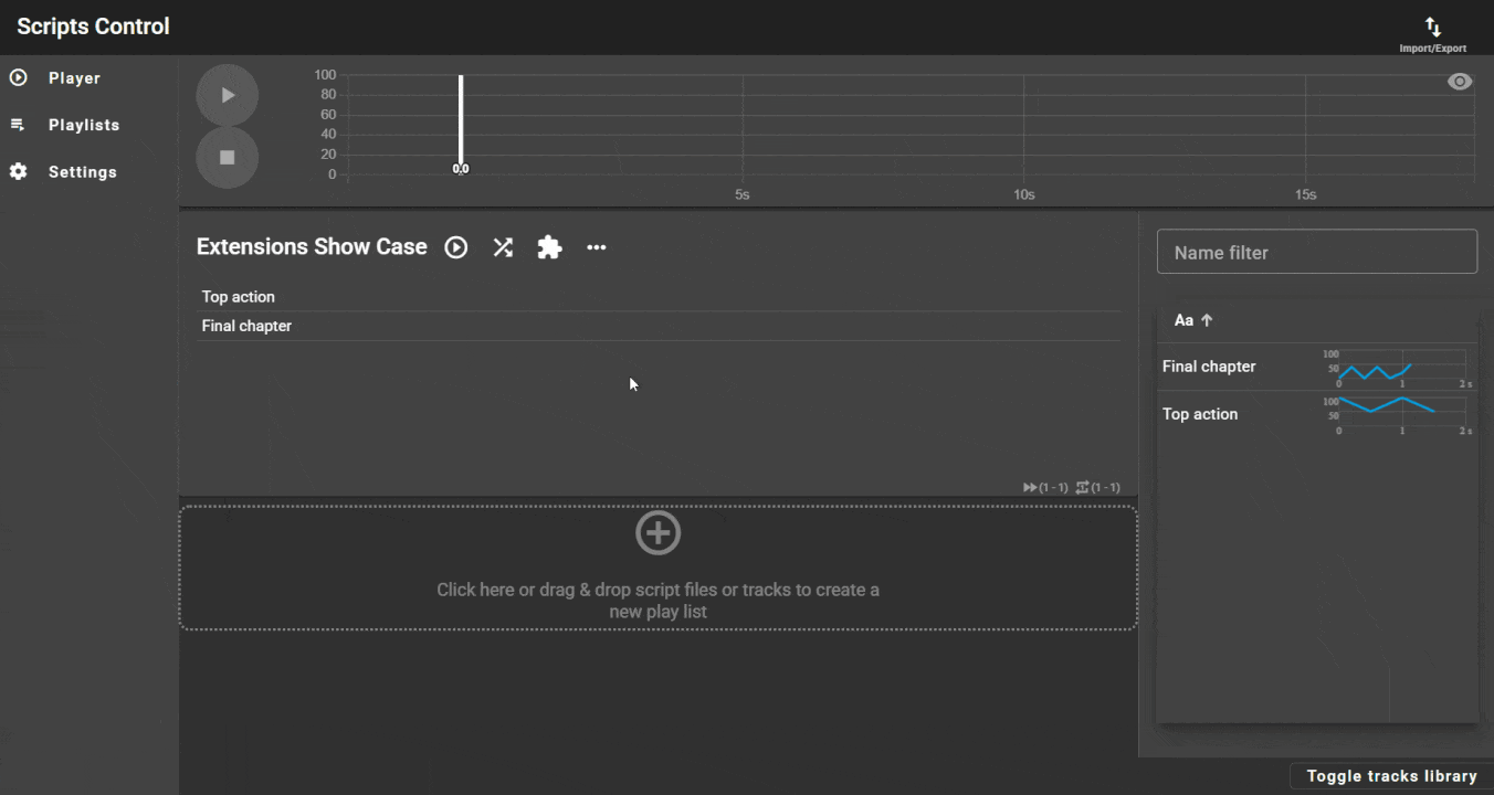 But if you want multiple presets or share your content, you can use the export function from the top right menu to save your tracks and playlists (with configurations) into a .scriptscontrol file that you can import later.